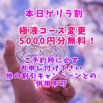 2026 0324 3/24本日ゲリラ割開催中!! 本日ゲリラ割開催中♥ 90分以上のコース対象 極液コースへの変更5000円分無料♥ ご予約の際必ずお申し付けください。ない場合は適用外となります! 他の割引キャンペーンとの併用はできません。 3/16ゲリラ割開催中 前の記事 3/30本日ゲリラ割開催中!! 次の記事